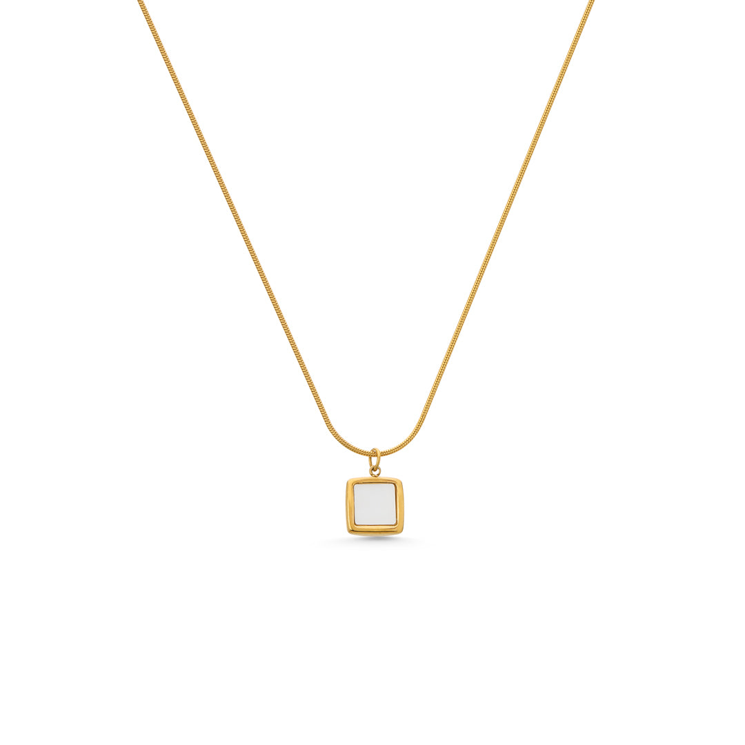 The Danica Necklace is a minimalist gold necklace featuring a square mother-of-pearl pendant. The delicate chain and simple design make it a versatile piece that can be dressed up or down.